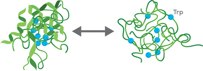 Figura 1 Per le proteine, lo spettro della fluorescenza emessa dipende dall’ambiente locale intorno agli aminoacidi fluorescenti. Lo spettro di fluorescenza di una proteina ripiegata con tasche idrofobiche altamente non polari avrà un aspetto diverso dallo spettro di una proteina non ripiegata con gli aminoacidi fluorescenti esposti a un ambiente acquoso più polare