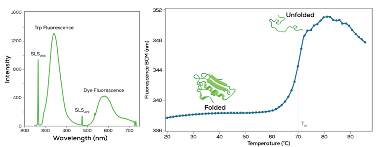 Con l’aumento della temperatura, la struttura delle proteine va in contro ad un processo di dispiegamento che porta alla variazione dell’esposizione di amminoacidi intrinsecamente fluorescenti, come il triptofano (Fig. 1), generando un segnale che permette di monitorare il processo di unfolding (Fig. 2). In assenza di sufficiente fluorescenza intrinseca è possibile impiegare appositi coloranti fluorescenti che si legano alle regioni idrofobiche esposte della proteina in fase di denaturazione.