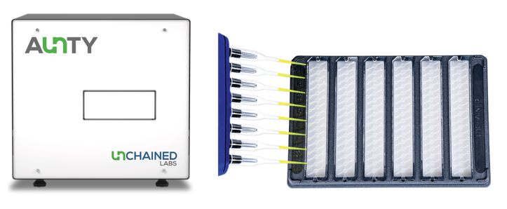 Lo strumento Aunty di Unchained Labs (Fig. 3) combina misure di DSF, light scattering statico e light scattering dinamico di campioni in speciali piastre da 96 pozzetti per fornire risultati su denaturazione e aggregazione delle proteine, simultaneamente sullo stesso campione. Se si aggiunge l’analisi personalizzabile attraverso il rilevamento della fluorescenza a spettro completo, si ottiene uno strumento flessibile pronto a rispondere a qualsiasi domanda sulla stabilità delle proteine con una velocità e una qualità dei dati senza pari.