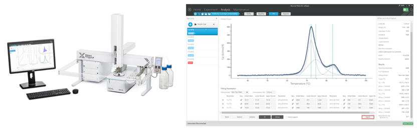 Figura 5 Strumento MicroCal PEAQ-DSC di Malvern Panalytical e schermata rappresentativa del software con selezione delle transizioni e modelli di deconvoluzione.