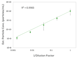 Figura 3. Concentrazione stimata lungo una serie di diluizioni a fattore cinque, fino a una diluizione finale di 1:625, effettuata su un campione di LNP di piccole dimensioni. Le barre di errore rappresentano la deviazione standard calcolata su 4 repliche analizzate su ciascuno dei 5 strumenti.
