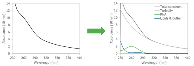 Gli algoritmi Unmix attuano una deconvoluzione del segnale totale di assorbimento, estraendo il contributo all’assorbimento dei singoli componenti dallo spettro di assorbimento totale, in modo da offrire informazioni separate su LNPs & buffer, RNA e torbidità. Questo processo permette di conoscere la quantità totale di RNA in μg/mL e numero di molecole presenti nel campione, fornendo informazioni sul payload.