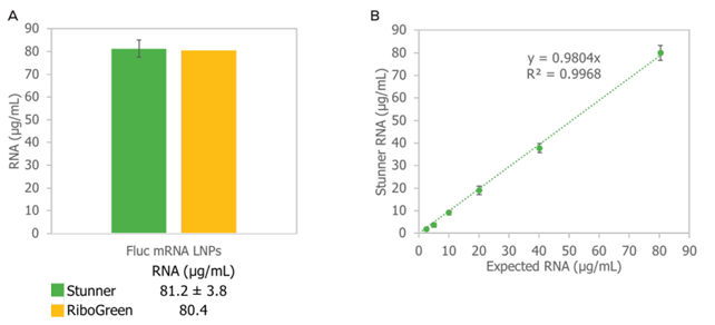 Figura 5. Valori di RNA totale su campioni di Fluc-mRNA-LNPs ottenuti con Stunner e RiboGreen® (A). Serie di diluizioni 1:2 di Fluc-mRNA-LNPs fino a una concentrazione di 1,2 μg/mL (B). I dati Stunner rispettano la quantità attesa di RNA e sono confrontabili al RiboGreen®.