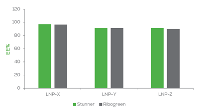 Figura 6. Efficienza di incapsulamento (EE%) di tre formulazioni di LNPs calcolate utilizzando il metodo ibrido Stunner/RiboGreen® (verde) e il saggio standard RiboGreen® (grigio).
